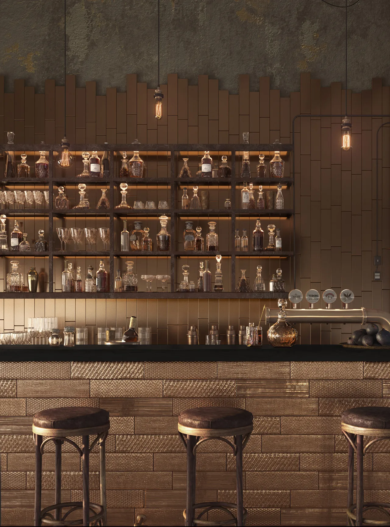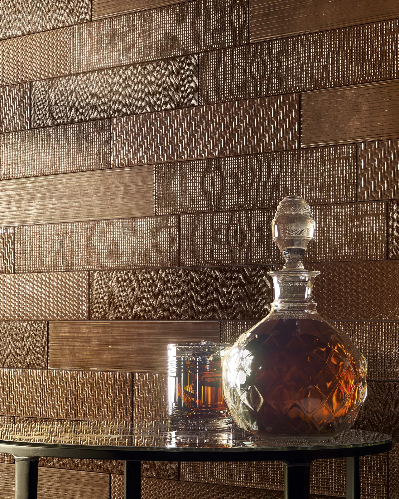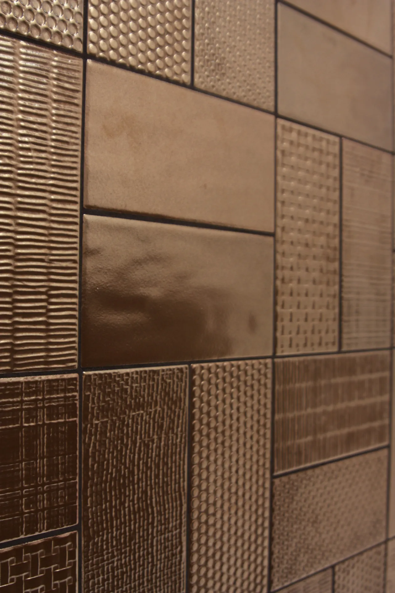 Developed in copper, platinum and black colours, Metal has different surface characteristics: smooth in 10×40, slightly wavy in 10×20,5 embossed textures in 10×40 Carving and 8 embossed designs in 10×20 Graffiti. The designer can combine decoration and plain tiles to create highly scenographic compositions with contemporary style.