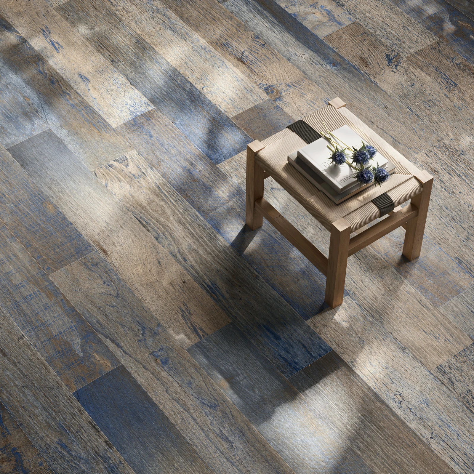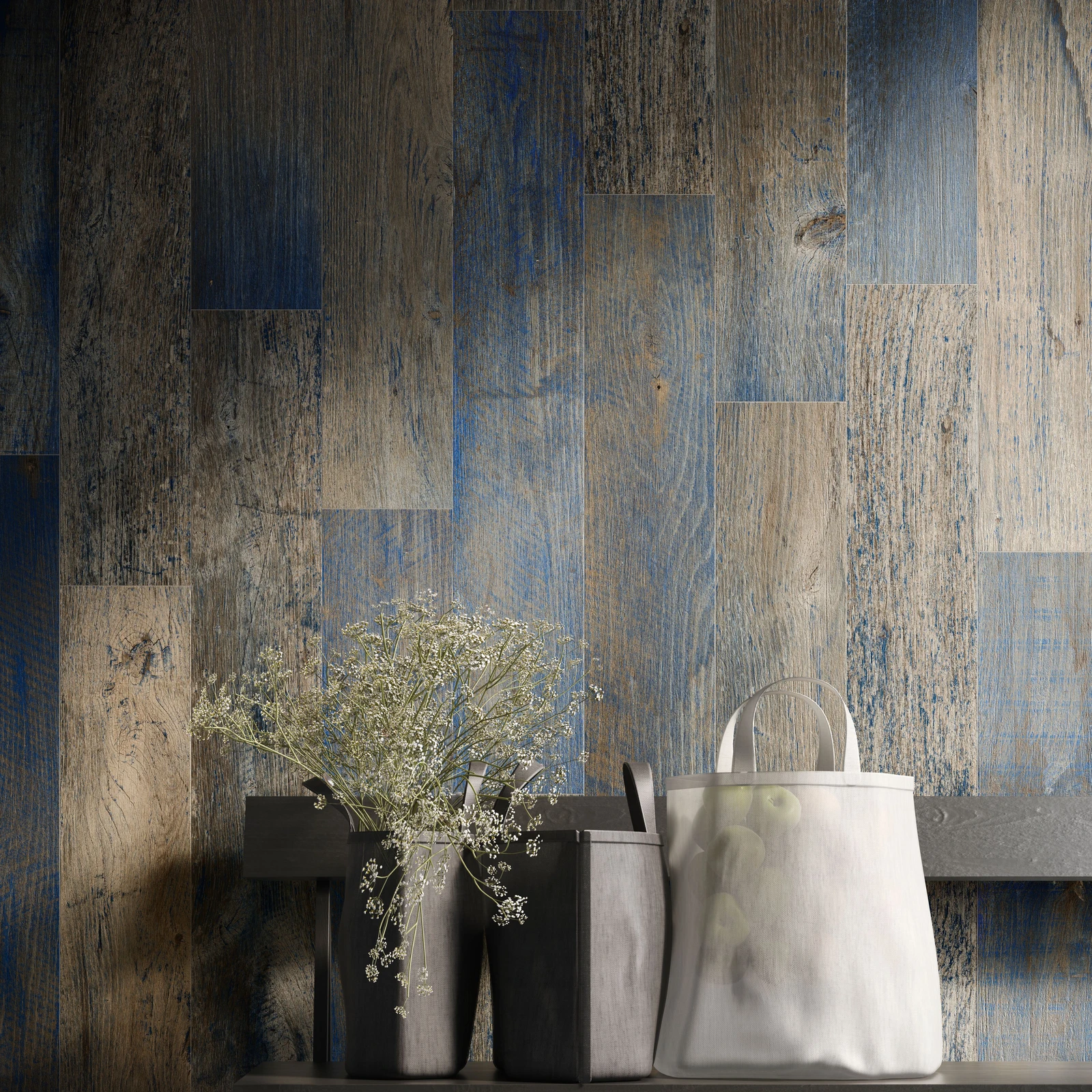 The Yorkwood collection is inspired by the natural character and rustic charm of English oak wood. The Navy variant introduces a bold navy blue color while maintaining authentic wood grain textures with 60 unique faces for minimal repetition. The surface is matte and rectified edges allow for precise installation with minimal grout lines. This tile combines aesthetics with technical performance including high slip resistance and durability, ideal for contemporary residential and commercial interiors seeking colorful wood-effect flooring and wall cladding. The collection also includes decorative mosaics and chevron patterns for design versatility.
