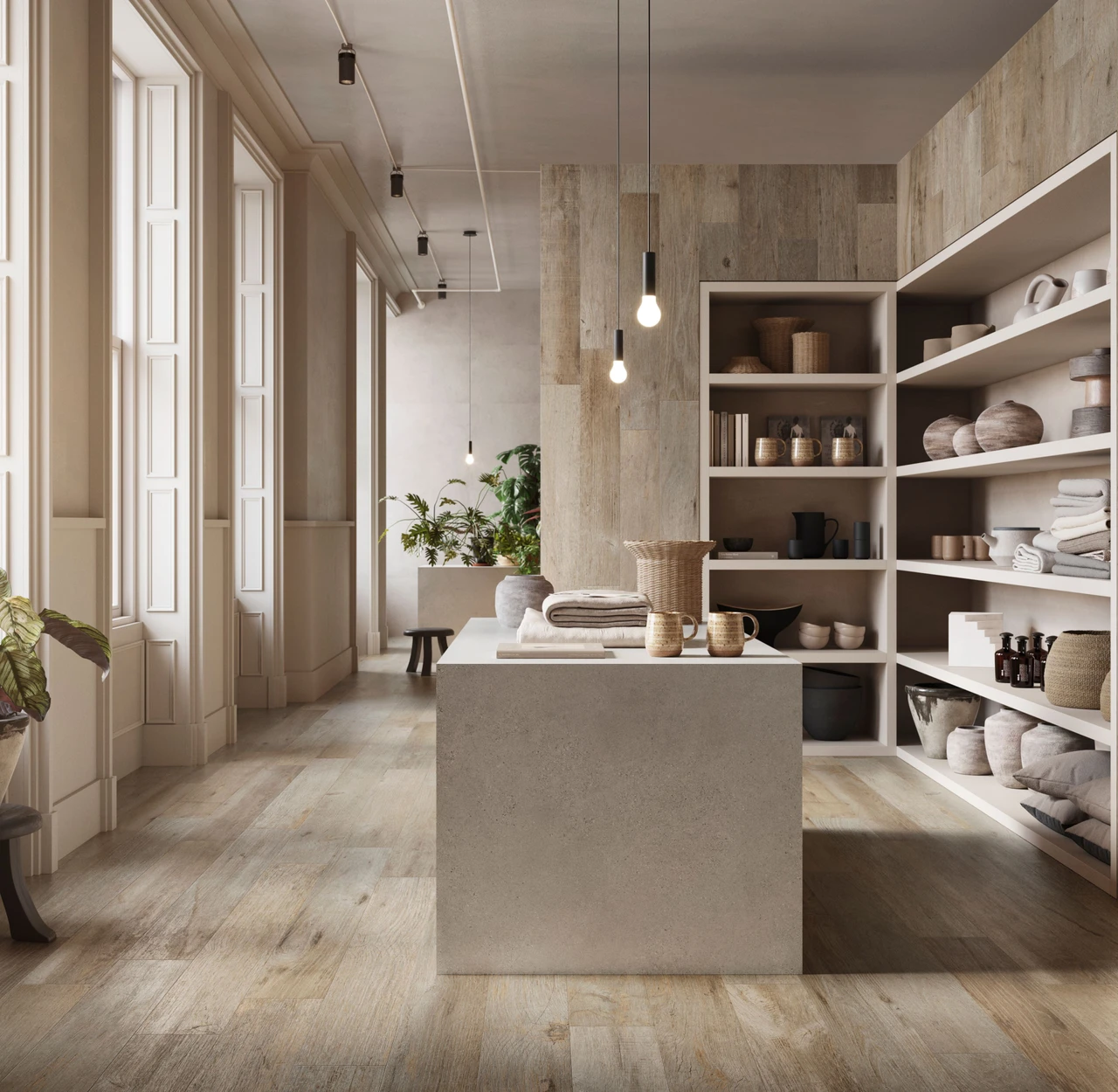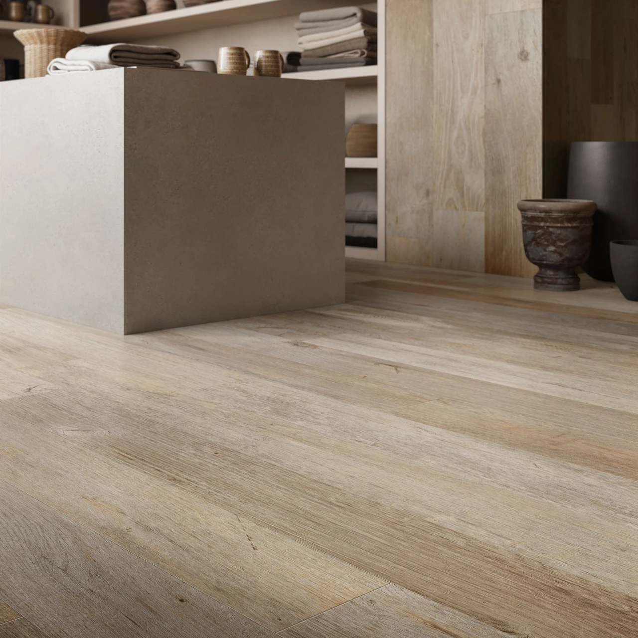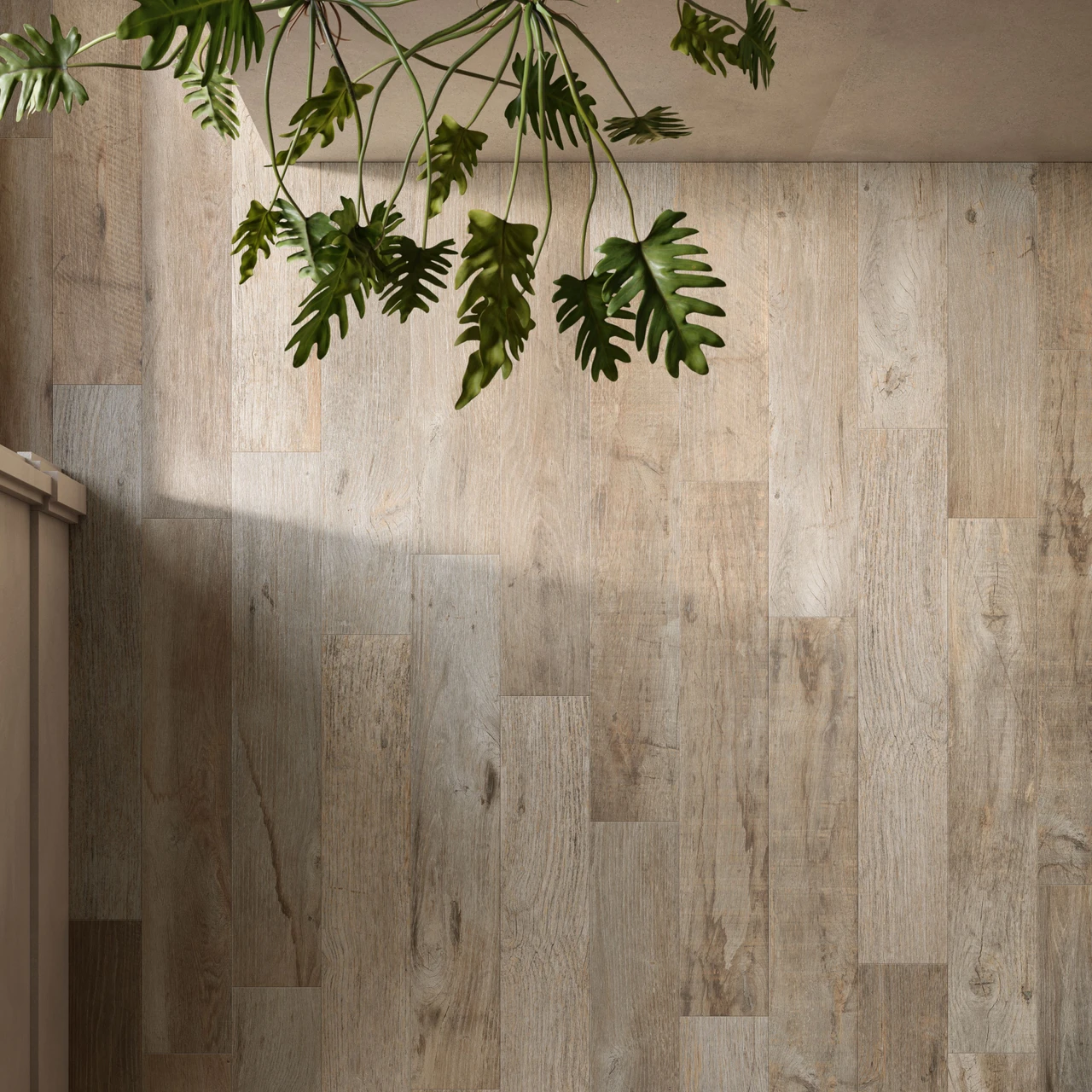 Yorkwood Natural is a wood-effect porcelain stoneware tile from Sant Agostino’s Yorkwood collection. It embodies the raw, unstained beauty of oak wood, featuring subtle wood grain patterns and a matte finish. Available in plank sizes such as 30×120 cm and 300×1800 mm, with a thickness of 9 mm, it is designed for indoor floors and walls.