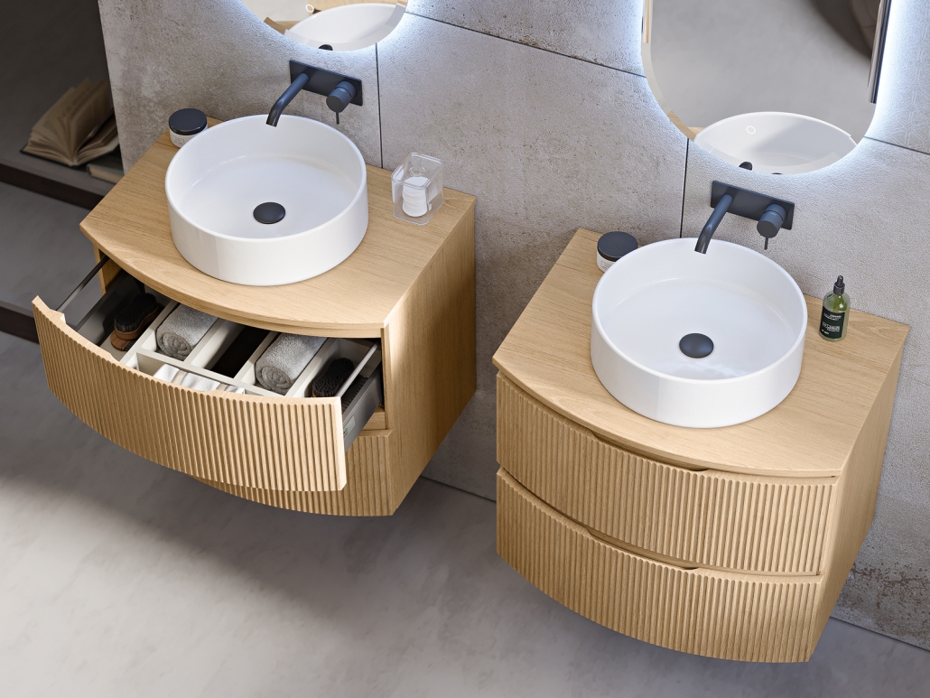 The characteristic rounded shape is embellished with an innovative fluted finish available in multiple matt and wood chromatic variants in a wide modularity of its components equipped with doors and drawers with soft-closing system and ghost handles, also for furnishing smaller spaces without sacrificing comfort and aesthetics.