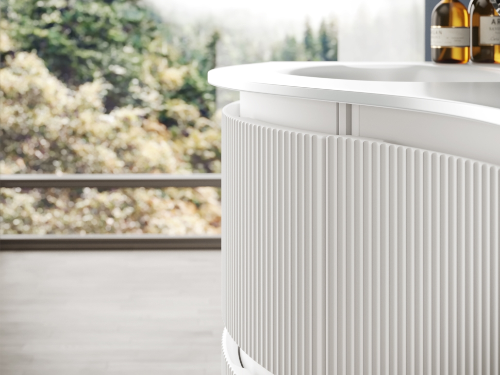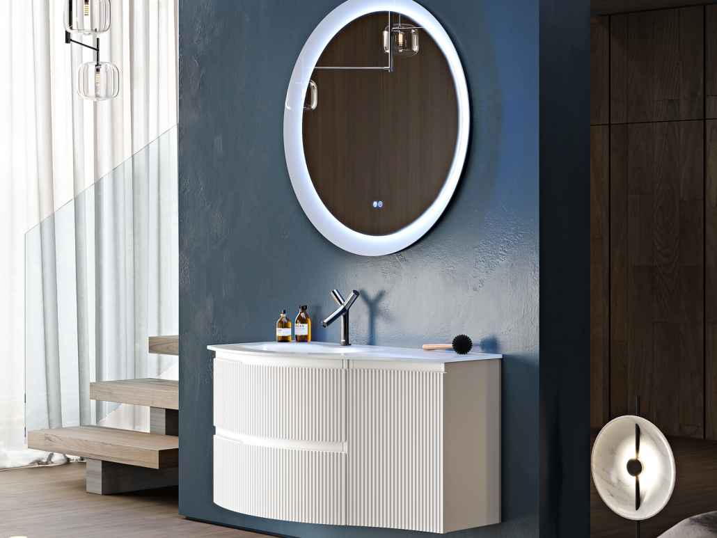 The characteristic rounded shape is embellished with an innovative fluted finish available in multiple matt and wood chromatic variants in a wide modularity of its components equipped with doors and drawers with soft-closing system and ghost handles, also for furnishing smaller spaces without sacrificing comfort and aesthetics.
