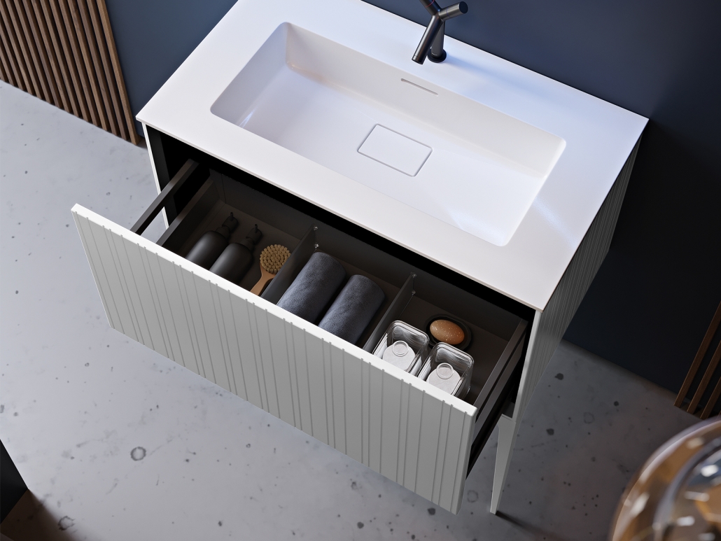 “Interior decorating is the art of arranging beautiful things comfortably.” said the designer Billy Baldwin and it is precisely from this principle that the Portofino Collection was born, whose aesthetic component is never subordinate to comfort and practicality of use.The elegance and refinement of this Collection are denoted by the thin solid wood leg, a natural continuation of the cabinet made in 1 cm folding with fluted effect on the fronts and sides in multiple matt colours and wood finishes.