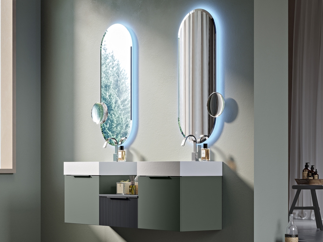 The Premium Collection also includes backlit mirrors equipped with touch system for switching on and off, dimmable, both rectangular and oval, in multiple sizes combined with metal grids for the installation of shelves on multiple heights: a Collection with new aesthetic details and functional for a daily routine that does not give up on style.