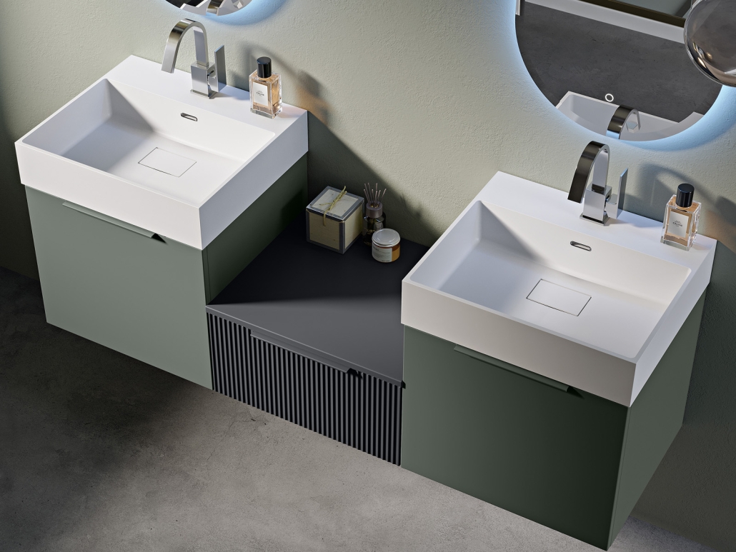 Design, technological research and innovative materials come together in the Premium Collection with an original and refined design that focuses on the customization and modularity of its accessories.The Premium Collection provides for the creation of elements from 50cm up to 120cm to be modular in infinite combinations, even in overlapping, coordinated by matt white resin washbasins, also made to measure, in combination with all the drawer units, to satisfy every living and functional need. The highly containing drawers, double height and with optional wheels kit, are dressed with plain or plissé fronts together with elegant colored handles, dark interiors and slim black guide with soft-closing system.