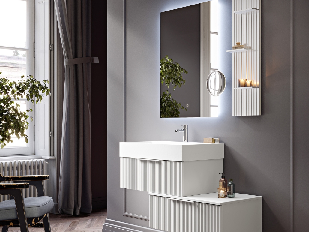 The Premium Collection also includes backlit mirrors equipped with touch system for switching on and off, dimmable, both rectangular and oval, in multiple sizes combined with metal grids for the installation of shelves on multiple heights: a Collection with new aesthetic details and functional for a daily routine that does not give up on style.