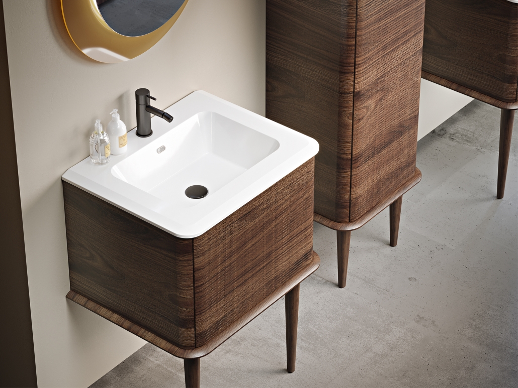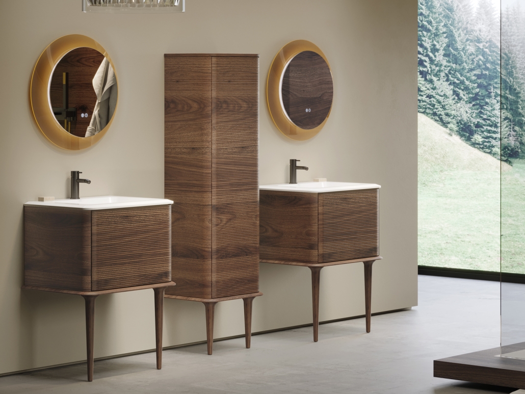 The Idra Collection was born from the concept of a bathroom environment in which the typical elegance of classic design is reinterpreted in a modern key with elements of strong stylistic connotation capable of giving a new light to the panorama of bathroom furnishings. Timeless elegance and contemporary rigor come together in a game of contrasts between curved lines and 3D geometries for a versatile and refined Collection. Available in the hanging version or with solid wood feet, the Collection has sides with finely rounded edges that welcome fronts with horizontal fluted decoration in a vast range of nuances and sizes.