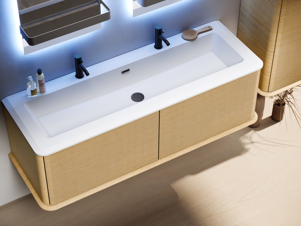 The Idra Collection was born from the concept of a bathroom environment in which the typical elegance of classic design is reinterpreted in a modern key with elements of strong stylistic connotation capable of giving a new light to the panorama of bathroom furnishings. Timeless elegance and contemporary rigor come together in a game of contrasts between curved lines and 3D geometries for a versatile and refined Collection. Available in the hanging version or with solid wood feet, the Collection has sides with finely rounded edges that welcome fronts with horizontal fluted decoration in a vast range of nuances and sizes.
