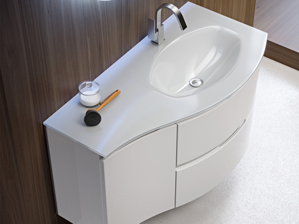 Soft and sinuous lines characterize the Vague Collection for lovers of aesthetics without sacrificing comfort.Designed also for furnishing small spaces, the line is characterized by practical doors and drawers with soft-closing system and ghost handles to be combined with washbasins in extralight white glass, matt black satin glass or in glossy white resin for a bathroom concept focused on the rationality of the forms and the practicality of use.