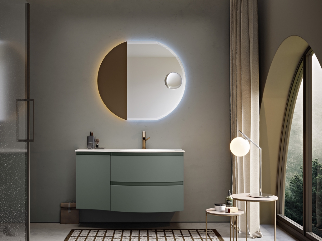 The line is completed by a system of well-equipped reversible cupboards with integrated magnifying mirror and backlit mirrors with touch on and off system available in various sizes to give the bathroom the right comfortable brightness.