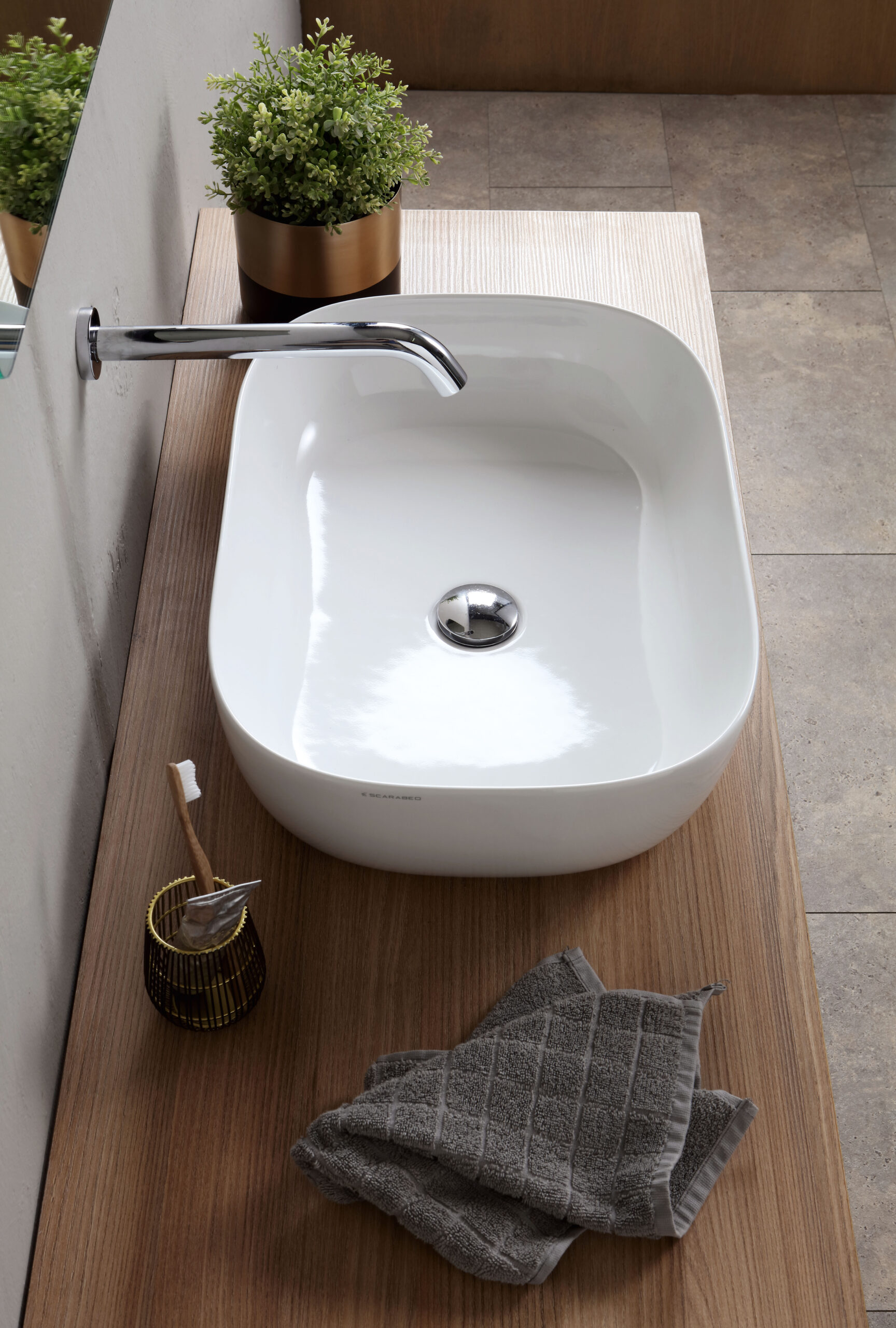 The Glam 56×39 washbasin is a countertop sanitary fixture made from premium ceramic. With its modern and soft lines, this bathroom furnishing element represents a perfect balance of elegance and functionality.